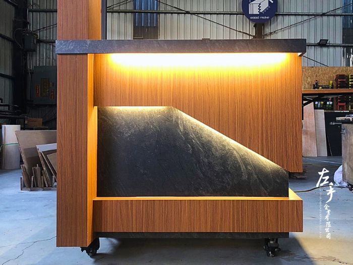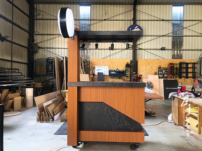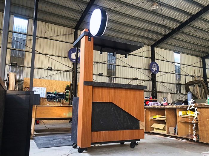 整體攤車以溫潤木色為主體,搭配深色石材質感飾面(仿岩板面處理),傳遞出現代典雅、職人細膩、內斂但有故事的品牌調性。