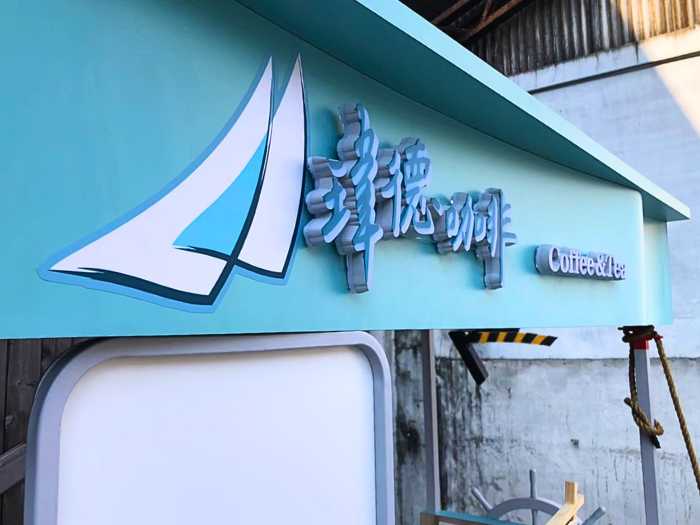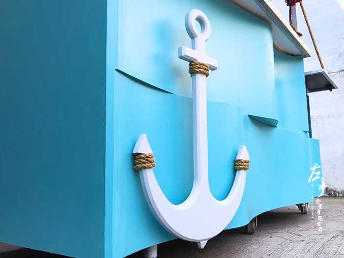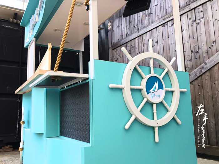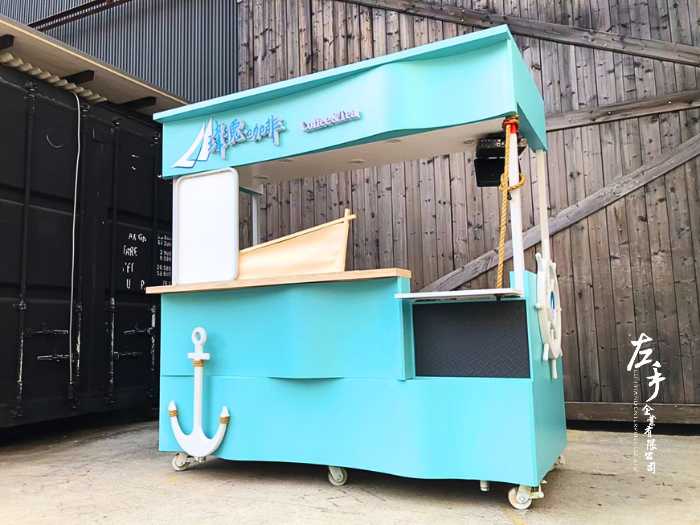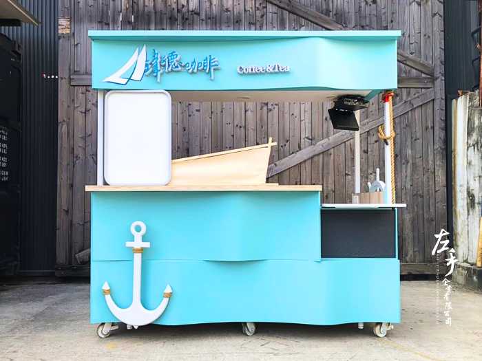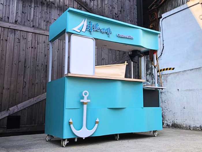 瑋德咖啡Wayde Coffee客製化品牌攤車,整體以清爽水藍為主色,搭配木紋桌面與白色鐵件,營造如碼頭般的清新氛圍。側邊裝飾船錨與繩索元素,強化品牌故事感,讓人一眼聯想到航海與遠方。