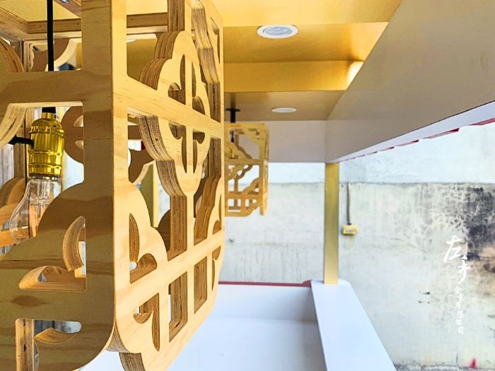 利用 CNC 精密雕刻技術,在車體外框打造出古風窗花。線條間交錯對稱,如同傳統木窗映出午後陽光,讓整體外觀在實體與虛線之間展現通透感與藝術性。這樣的視覺語言,不僅成為品牌攤車的亮點,也象徵著東方美學與現代製作的優雅融合。